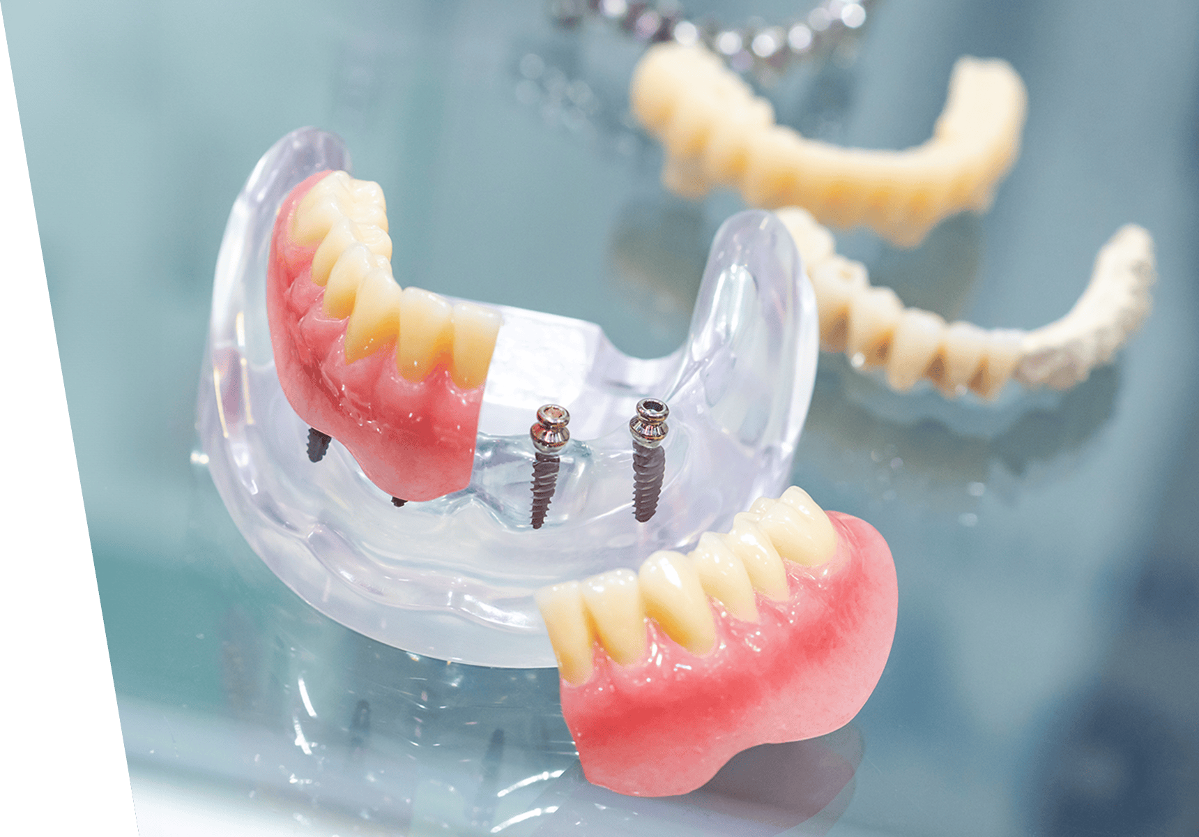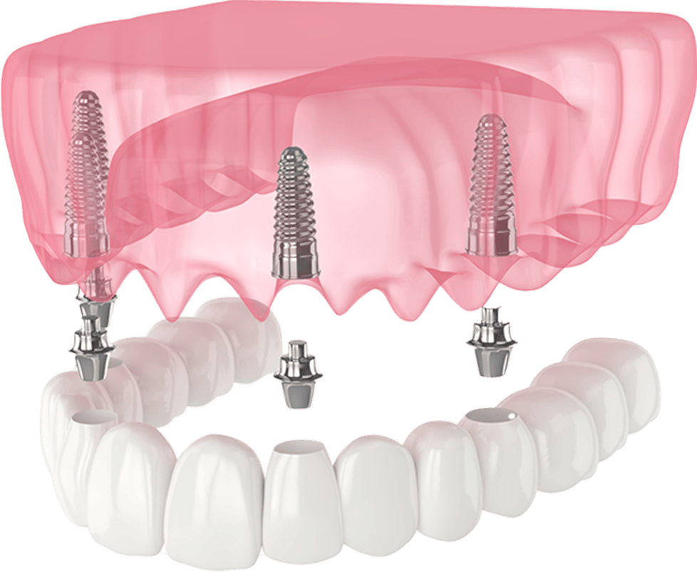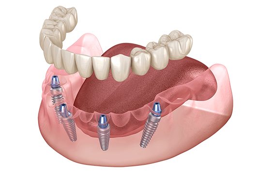 顎の骨に4~6本のインプラントを埋入し、その上に固定式の人工歯を装着する治療です。少ない本数でも全体の歯を支えることができ、総入れ歯に比べて安定感があります。