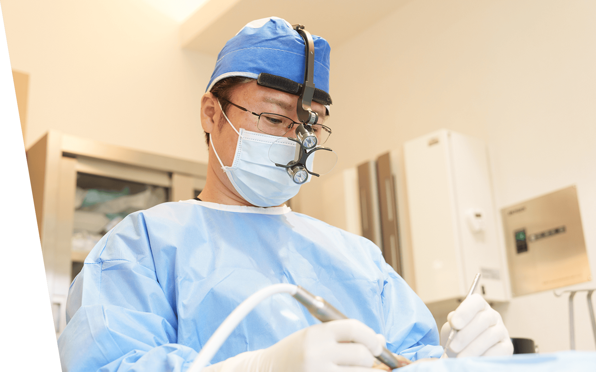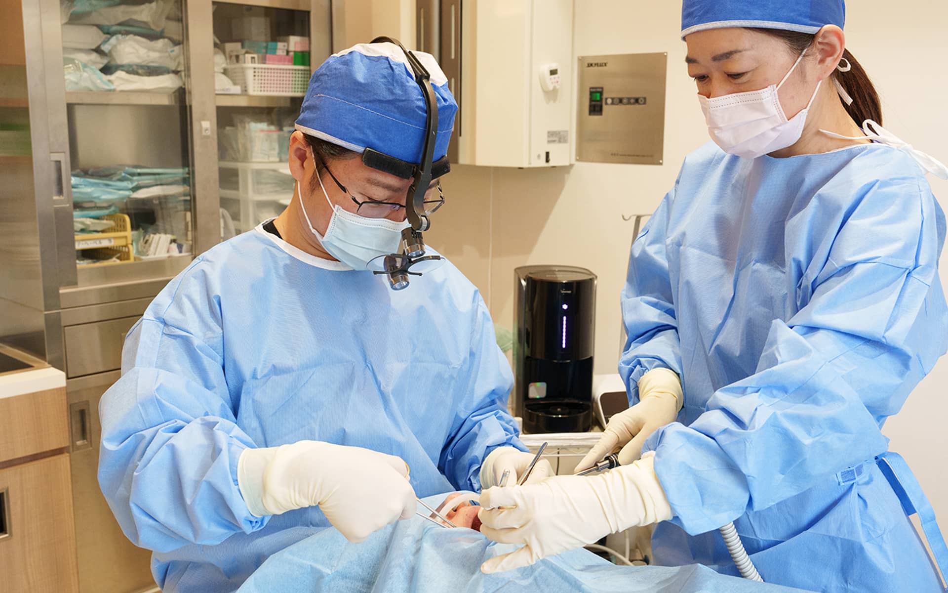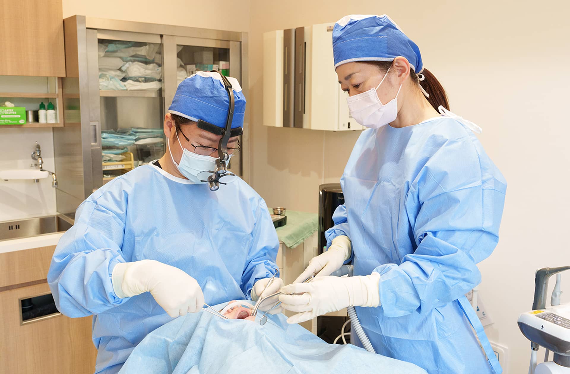 患者さんの負担をできるだけ減らすため、ピエゾサージェリーという手術器具を導入しています。これは骨や歯などの硬い組織だけに反応する切削器具で、お口の粘膜や歯ぐき、神経、血管などのやわらかい組織を傷つける心配がありません。その結果、より安全かつ精密な手術の提供が可能となります。