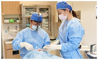 患者さんの同意が得られましたら、インプラントを埋め込む手術を行います。手術は麻酔を十分に効かせた状態で行いますので、治療が不安なかたや、痛みが苦手なかたでもご安心ください。手術から歯の装着までの期間は下顎で約1.5ヵ月、上顎で約2.5ヵ月が目安となります。