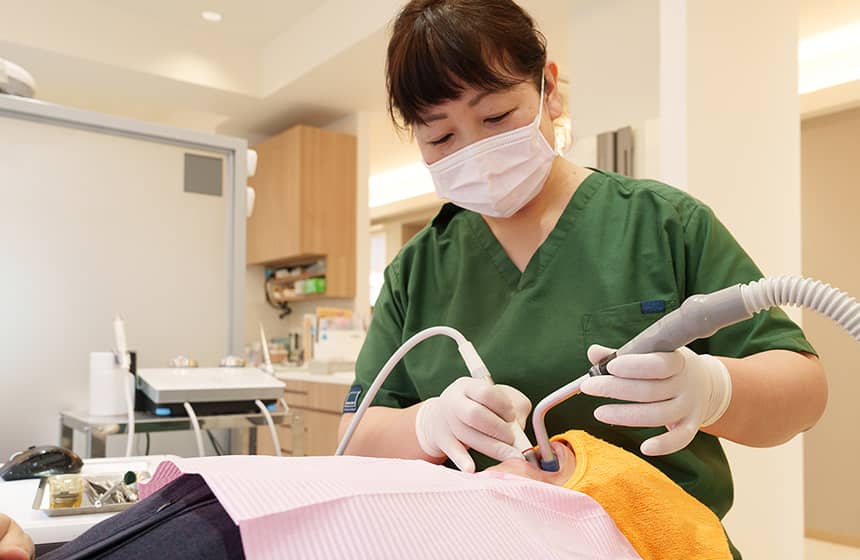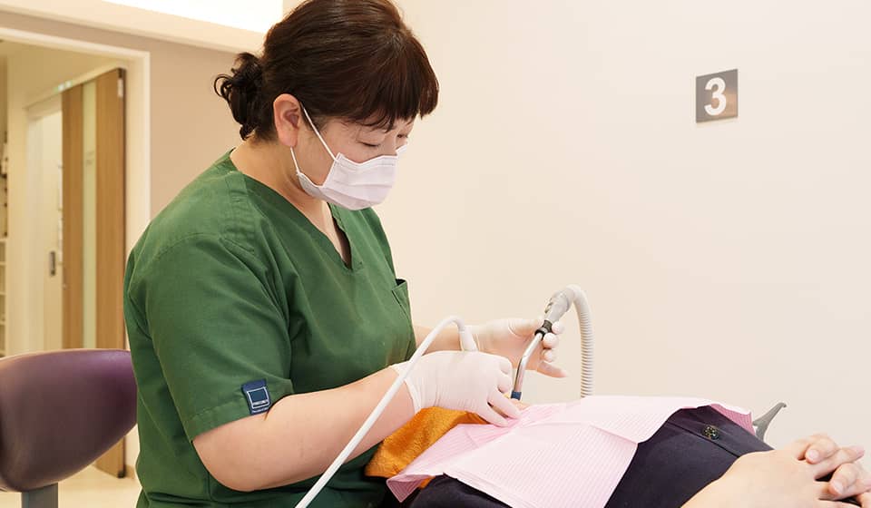歯やインプラントにみがき残しがないかをチェックさせていただきます。日々のブラッシングで落としきれない汚れや歯垢をチェックすることで、トラブルが大きくなる前に対応することが可能です。さらに、患者さんのお口の状態に合わせたアドバイスも行い、インプラントを長く健康に保つサポートをします。