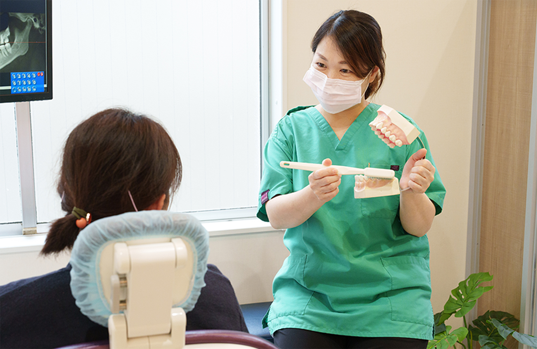 当院では、アフターメンテナンスの一環として、年に2~3回の定期的なメンテナンスをおすすめしています。お口の中の状態を丁寧にチェックし、クリーニングを行うことで、インプラント周囲の健康を守り、トラブルの早期発見や予防につなげています。