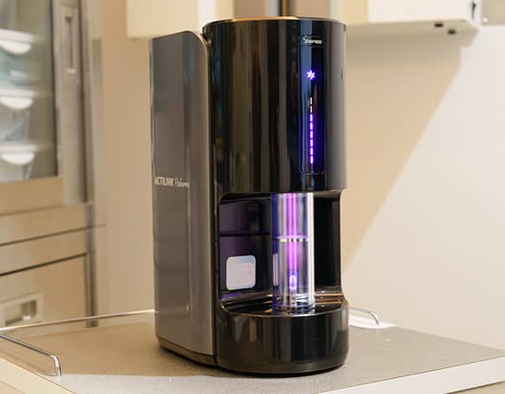 チタン製インプラントは、空気に触れると表面に不純物が付着し、骨との結合力に影響する場合があります。そこで当院では、治療に使用する直前に真空プラズマ処理を施し、不純物を除去したうえで骨となじみやすい超親水性表面へ整えています。こうすることで、インプラント本来の性能が発揮され、脱離リスクの軽減につながります。
