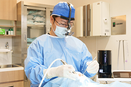 当院では痛みが不安なかたやリラックスして治療を受けたいかたに向けて、笑気吸入鎮静法を導入しています。緊張や不安を和らげる効果があり、手術中に感じる恐怖や抵抗感を軽減します。また、緊張が強い場合には鎮静剤を使用する場合もございます。患者さんが安心して治療を受けていただける設備を整えておりますのでご安心ください。